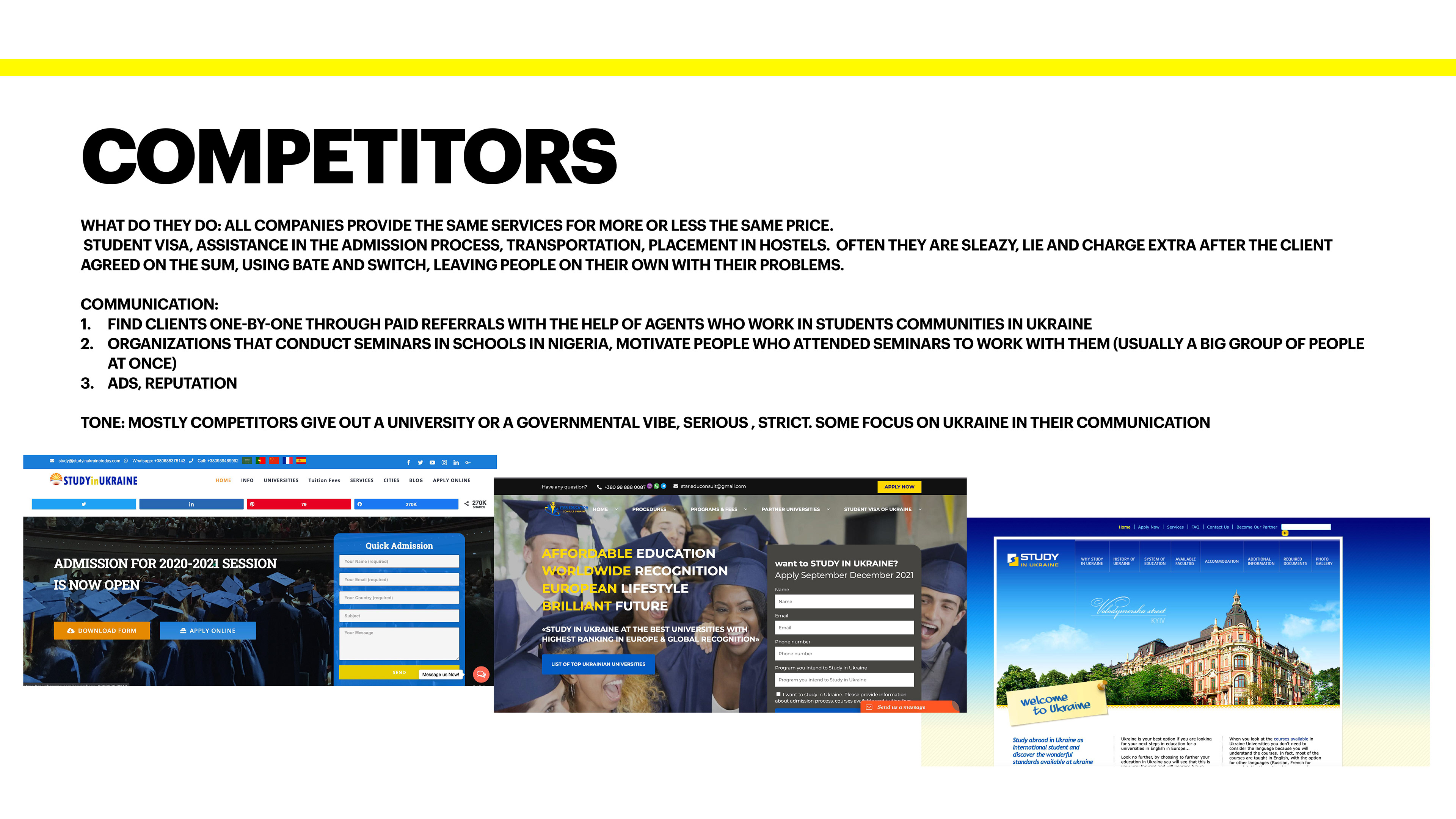 I've researched the market for African students coming to study in Ukraine (pre-full-scale invasion project) and communication styles of the competitors to create positioning and direction for a potential niche disruptor.